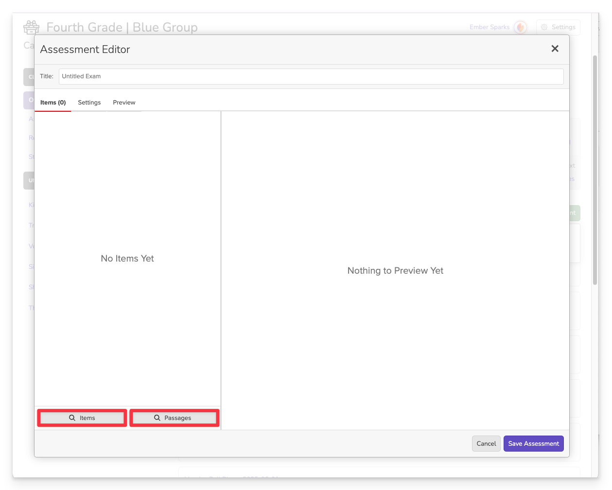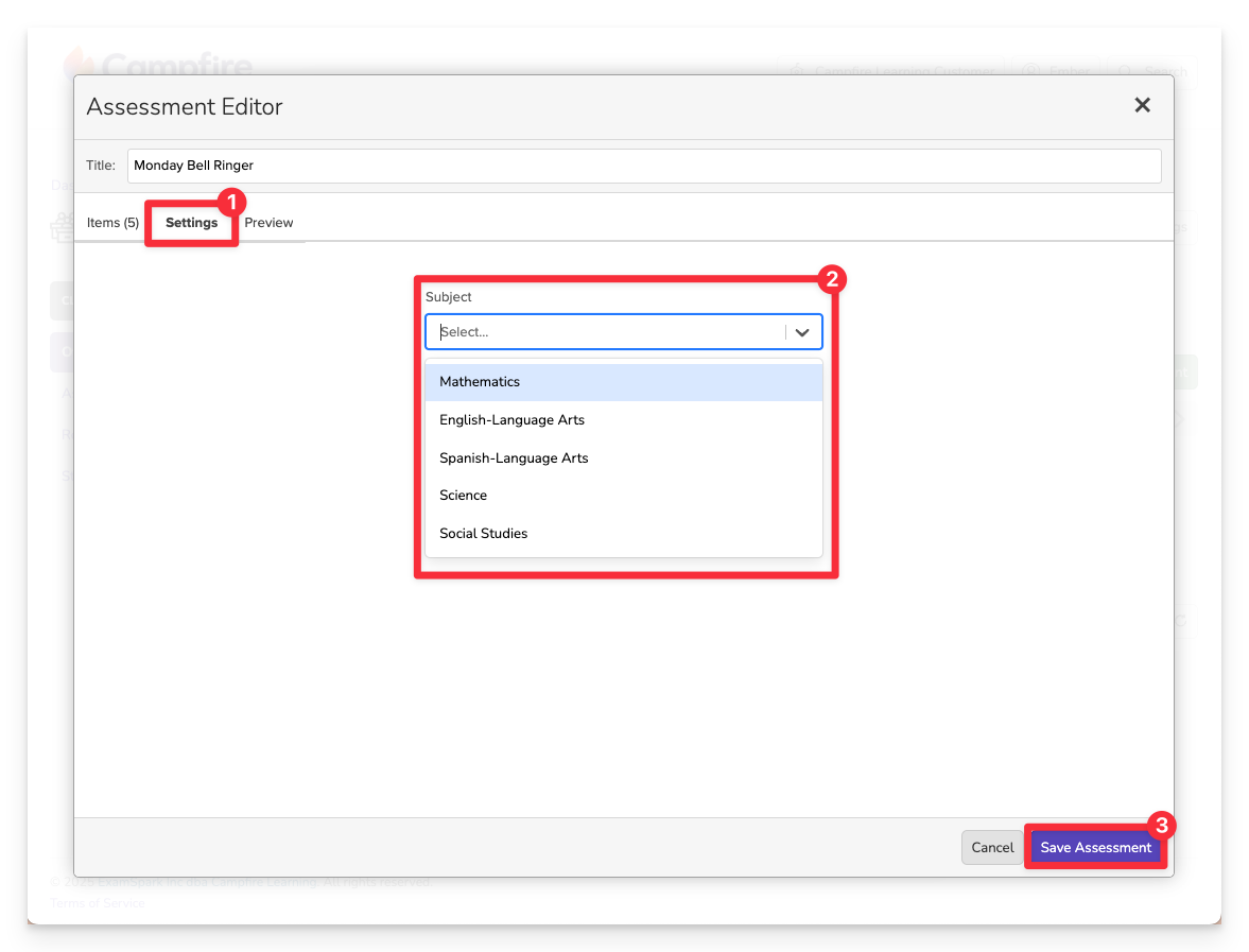 In Campfire Classroom, you can create an assessment from the assignment modal or, in advance, from your library. Whether you start from the assignment modal or your library, the process for creating a new assessment is the same: