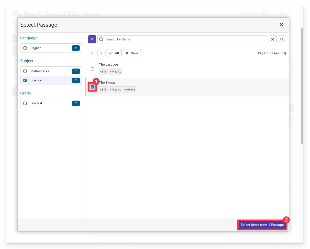 Use the [1] left filters or [2] search bar to find a passage by keyword, subject, grade, or standard, etc.