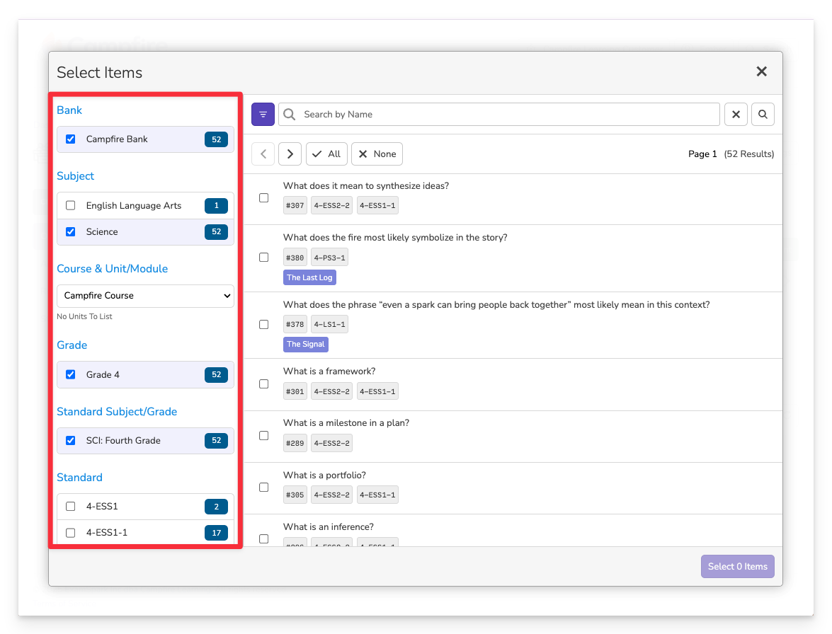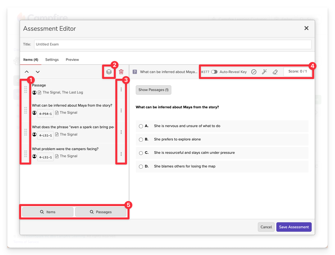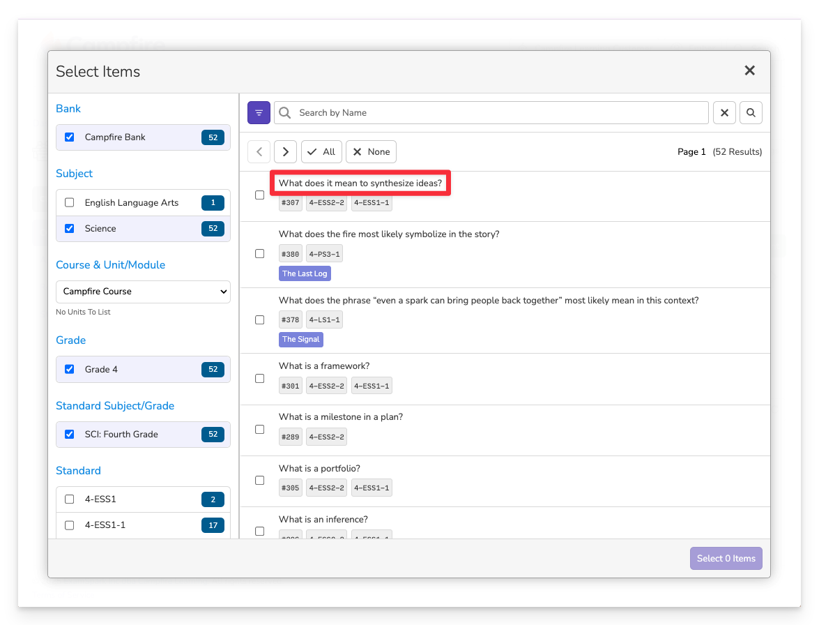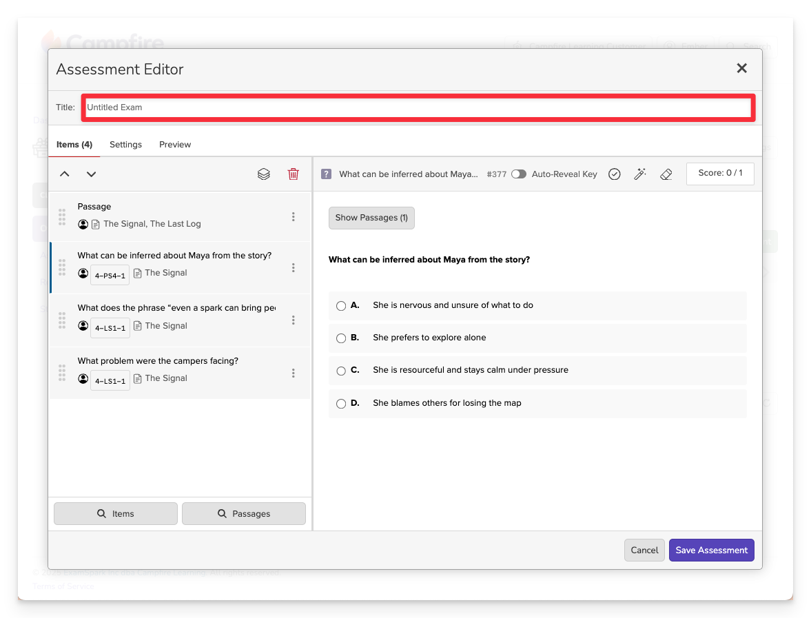 You can build assessments in Campfire Classroom by selecting questions from your item bank or, in some Campfire Classrooms, by creating your own questions from scratch.