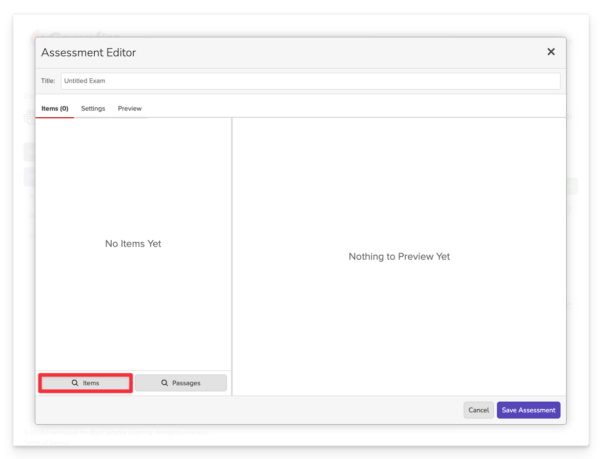 Choose Items as your method for creating the assessment.