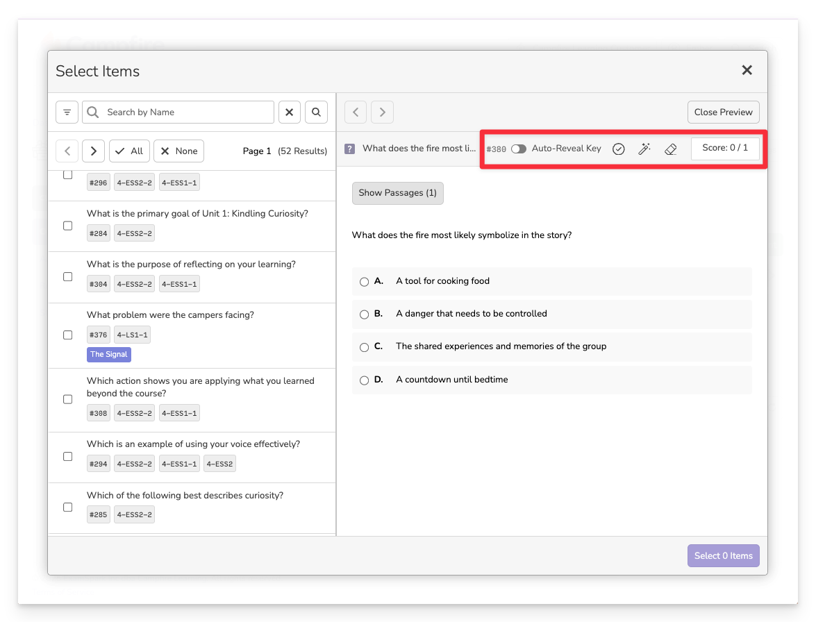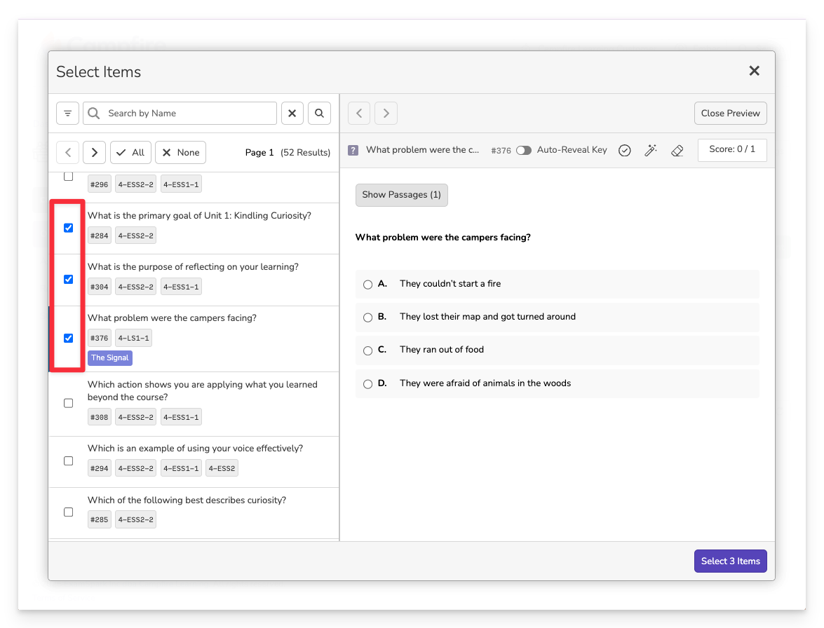 You can select multiple relevant passages to give yourself a broader pool of aligned items to choose from. Just remember—each passage will need to be read by students, so choose the number of passages thoughtfully.