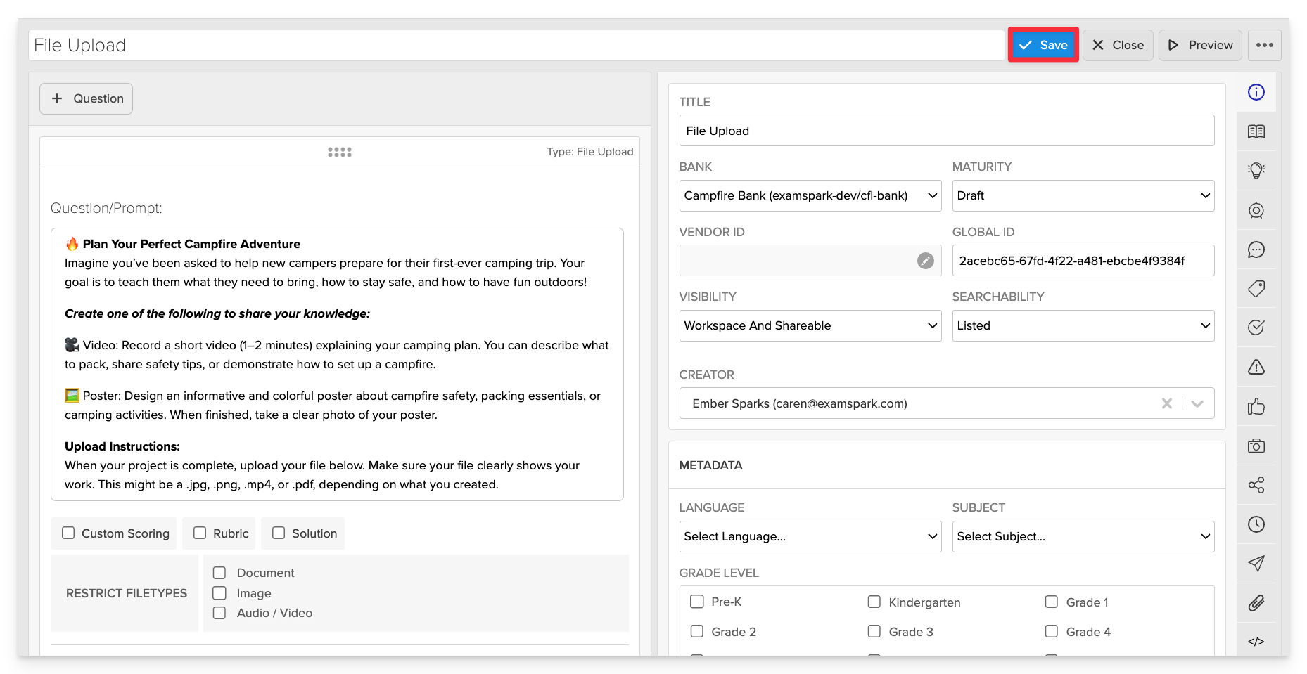File Upload items are manually scored by teachers, however authors can provide guidance on scoring parameters via the following: