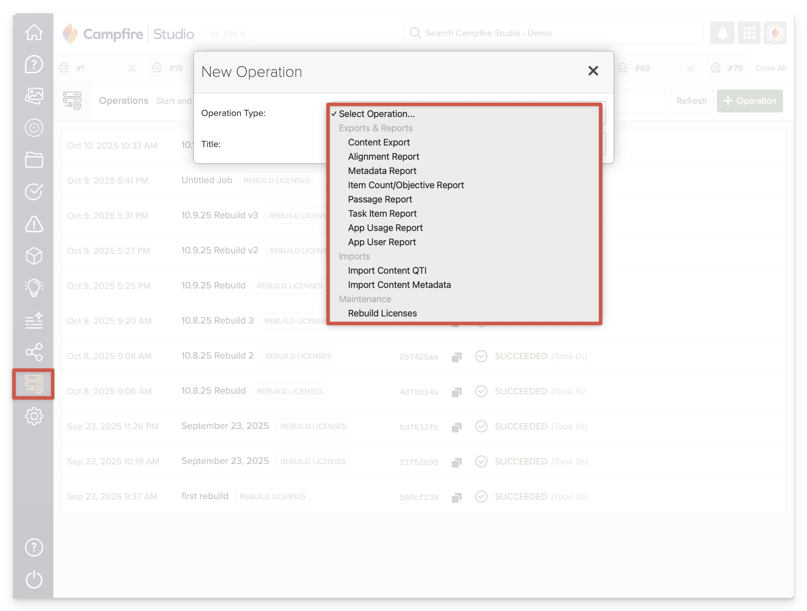 Operations are initiated from one or more item banks and can be downloaded once complete. Each operation type generates a different report or export file depending on your content management needs.
